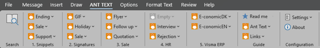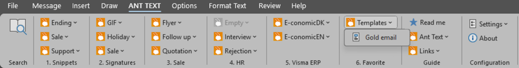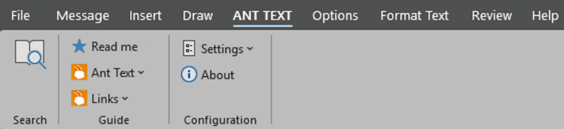 Whenever you write, reply, or forward an email, click the ANT TEXT tab in Outlook. Your personal Ant Text toolbar lives here.